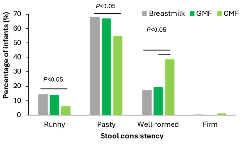 Data on bowel motion frequency (3-7 per day) and consistency of stools (overall softer) were closer to those of breastfed infants.† CMF-fed infants had fewer bowel motions (1-4 per day) and harder stool consistency than breastfed infants.‡ Analysis was undertaken for infants up to 4 months of age to avoid the confounding effects of other foods being introduced.