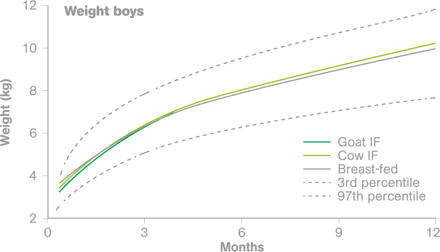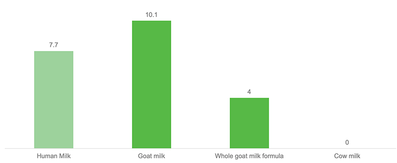 | Human milk | Whole goat milk formula | Goat formula, whey-adjusted, skim milk and vegetable oil-based* | Standard cow formula, whey-adjusted, skim milk & vegetable oil-based* | |