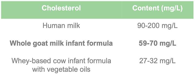 | Cholesterol | 90-200 mg/L | 59-70 mg/L | Lower than WGMF, likely similar to standard cow formula | 27-32 mg/L |