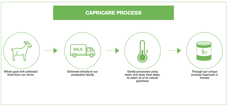 - Capricare® is made from only fresh whole goat milk as a source of protein, with no processed whey