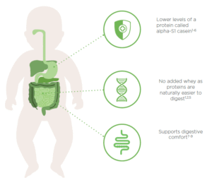 - Like breastmilk, goat milk is naturally A2. A2 milk has been shown to support digestive comfort, when compared to traditional cow milk containing A1 beta-casein.7-9